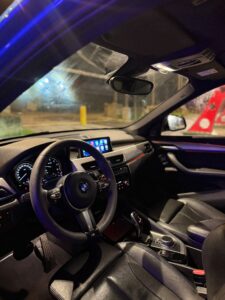 Son coloris Estorilblau 2 Metallic met en valeur son caractère sportif, tandis que son intérieur en cuir Dakota noir avec accents bleus M Performance renforce l’ambiance haut de gamme et dynamique.